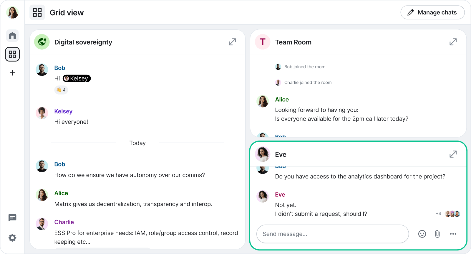 Why this matters for operational teams: Grid View is designed for secure, mission-critical environments where visibility and responsiveness are essential. While Grid View brings a new level of visibility to multi-room workflows, it’s intentionally focused. The interface is designed for high-density monitoring. Some features - like threads, widgets, pinned messages, and in-tile calling - aren’t included in this view to ensure performance and clarity when viewing several timelines at once. Such features remain available in All Chats view, and can be accessed quickly using “Expand”.